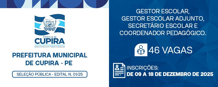 PREFEITURA MUNICIPAL DE CUPIRA -PE 8 de dezembro de 20258 de dezembro de 2025 Ghiulliano Campelo Concursos, Concursos em Andamento, Notícias EDITAL - PROCESSO DE SELEÇÃO DE PROFISISONAIS DA EDUCAÇÃO