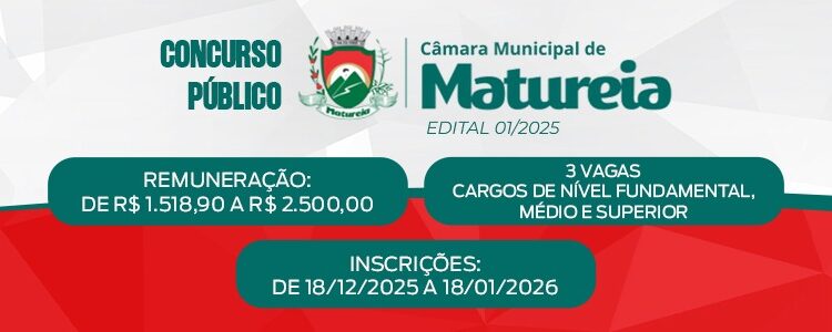 CÂMARA MUNICIPAL DE MATUREIA-PB 16 de dezembro de 202516 de dezembro de 2025 Ghiulliano Campelo Concursos, Concursos em Andamento, Notícias EDITAL DE CONCURSO PÚBLICO